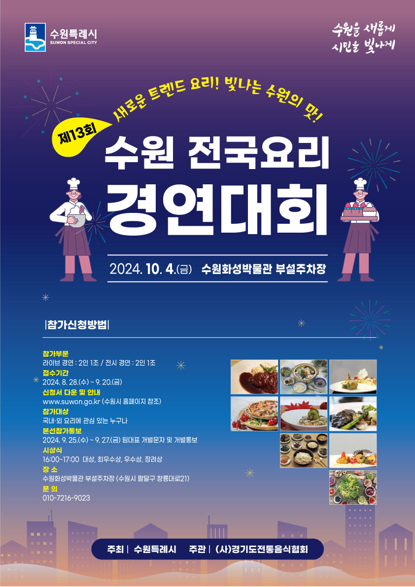 수원시(시장 이재준)가 ‘제13회 수원 전국요리경연대회’ 참가자를 8월 28일부터 9월 20일까지 모집한다고 밝혔다.