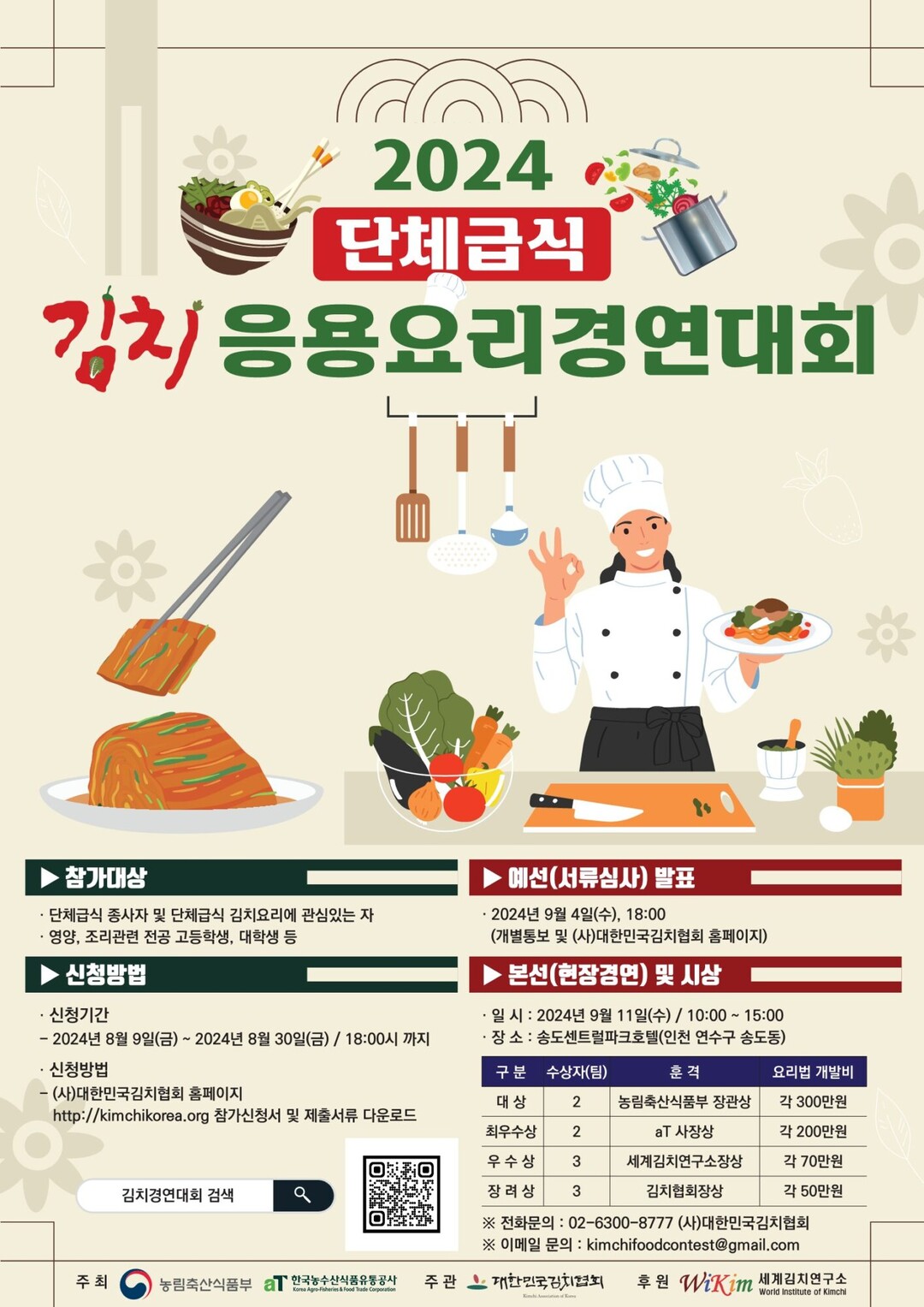 사단법인 대한민국김치협회에서 8월 30일 금요일까지 ‘2024 단체급식 김치응용요리 경연대회’ 참가자를 모집한다고 밝혔다.
