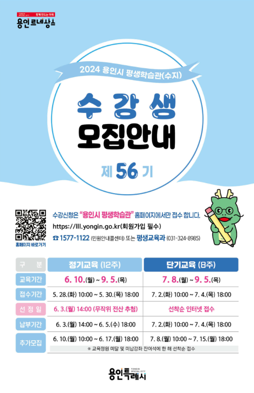 | 용인시평생학습관 제56기 수강생 모집 포스터 / 사진= 용인시 평생학습관 |