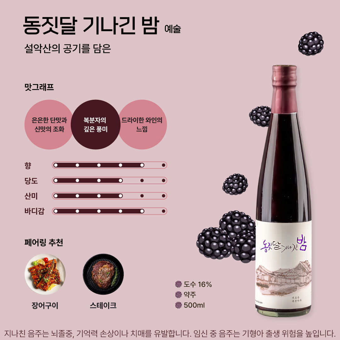 동짓달 기나긴 밤은 예술 양조장에 걸맞게 감성적인 이름이 눈에 띄는데, 이름처럼 오랜 시간 발효와 숙성을 거쳐 깊고 풍부한 맛을 자랑한다. 특히 레드 와인에 버금갈 정도의 고운 색감은 눈으로 먼저 즐기게 되고, 쌀과 복분자로 빚어 복분자의 깊은 풍미와 은은한 단맛을 부드럽게 느낄 수 있다. 이 약주는 특히 드라이한 맛 덕분에 장어구이와 궁합이 좋다. 가을의 정취와 어우러진 이 약주는 설악산의 청명함과 잘 어울린다.