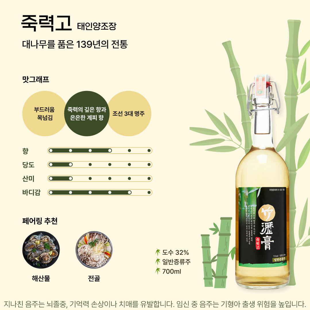 푸른빛과 황금빛이 섞인 투명한 색감을 지닌 죽력고는 은은하게 퍼지는 대나무 향과 부드러운 목넘김으로 고급스러움을 자아낸다. 특히 해산물 요리나 전골과 함께 한다면 그 맛을 한층 더 풍부하게 느낄 수 있다. 내장산의 아름다운 풍경을 감상한 뒤, 죽력고 한 잔을 곁들이면 그 여행이 더욱 가치 있게 느껴질 것이다.
