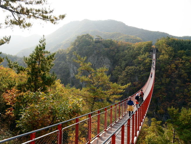 등산을 즐기면서 단풍을 만끽하고 싶다면 파주의 감악산 등산로를 추천한다. 감악산을 오르다 보면 마주하게 되는 출렁다리는 설마리 골짜기를 연결해 감악산을 하나로 이어주는 다리이다. 발 아래로 펼쳐진 절경과 함께 스릴 넘치는 경험을 할 수 있어 많은 사람들이 찾는다. 특히, 출렁다리를 건너면서 감악산의 붉게 물든 풍경을 감상할 수 있어 단풍철에 더 매력적인 등산코스이다.