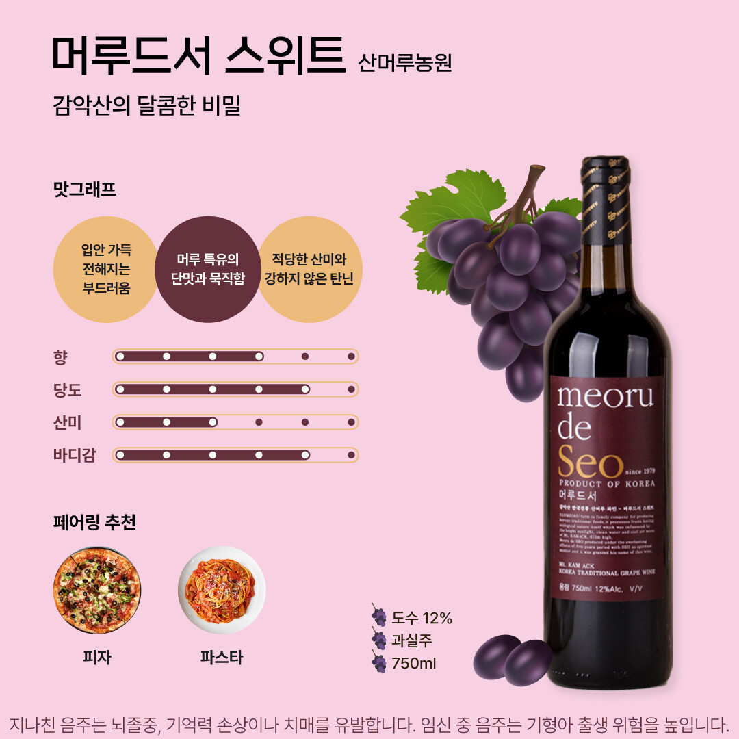 감악산 중턱에 위치한 산머루농원은 청정 지역인 감악산에서 재배된 100% 국산 산머루로 만든 와인을 만든다. 그렇게 해서 빚어진 머루드서 스위트 와인은 감악산의 큰 일교차 속에서 길러진 산머루를 사용해 신맛이 적고 당도가 높은 것이 특징이다. 5년 이상 숙성되어 부드러움이 극대화된 이 와인은 다크레드 컬러가 매력적이다. 머루의 매력을 가득 담고 있어 볼로네제 파스타나 피자와 잘 어울린다.