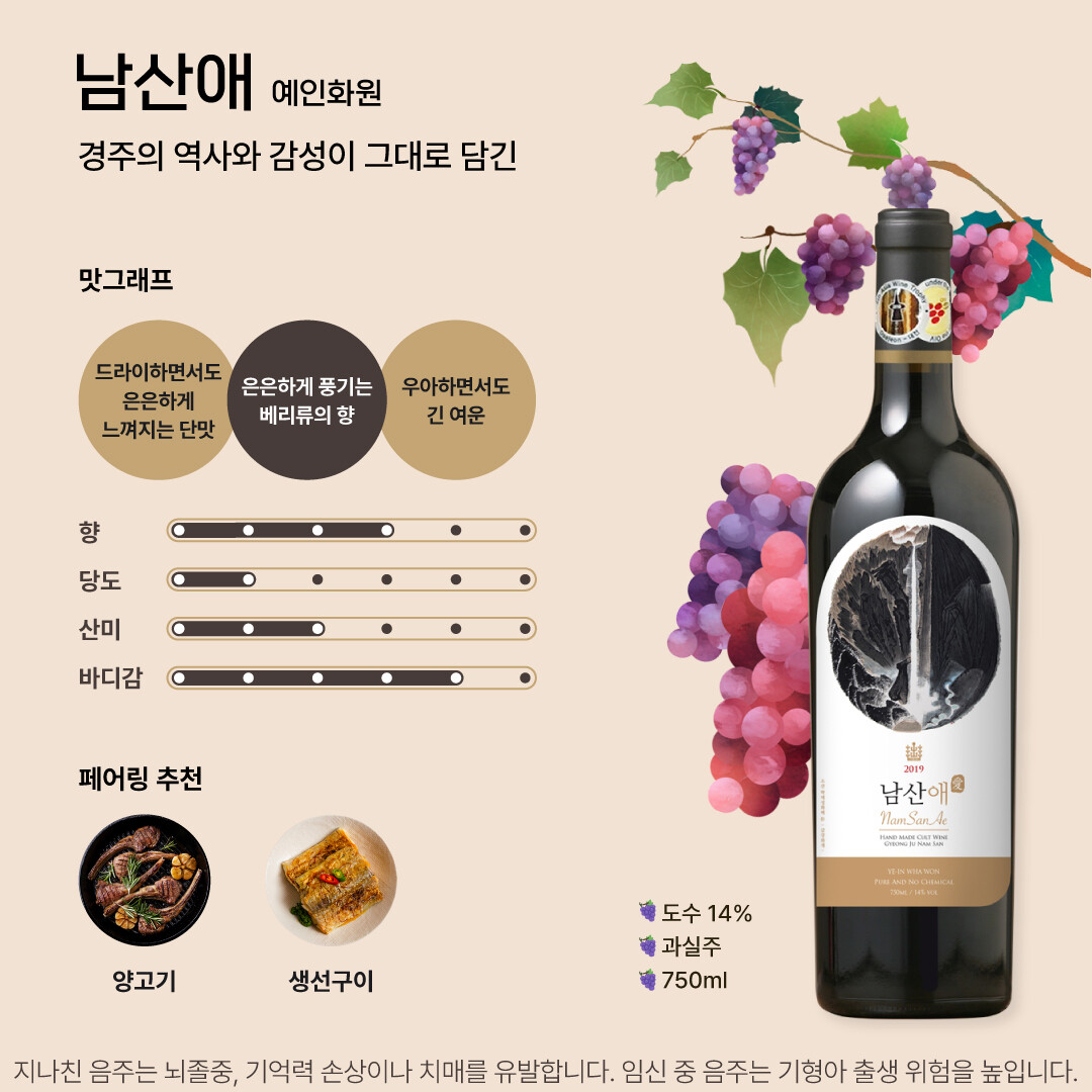 불국사와 가까운 경주 남산 자락에 위치한 예인화원에서 생산되는 남산애는 포도 100%로 만들어진 과실주이다. 여름이 지나도 수확하지 않고 가지에 매달린 채로 당도를 높인 포도로만 만들어져, 매년 달라지는 블렌딩 비율이 테이스팅의 재미를 선사한다. 캠벨과 머루가 이상적으로 배합되어 색감과 맛이 풍부하며, 중간 바디감으로 감칠맛이 돋보인다. 베리류의 은은한 향과 우아한 여운을 남기는데, 너무 달지 않으면서도 깊이 있는 맛을 지녔다. 양고기 스테이크, 생선요리와 페어링하기 좋고, 디저트 와인으로도 훌륭하다.