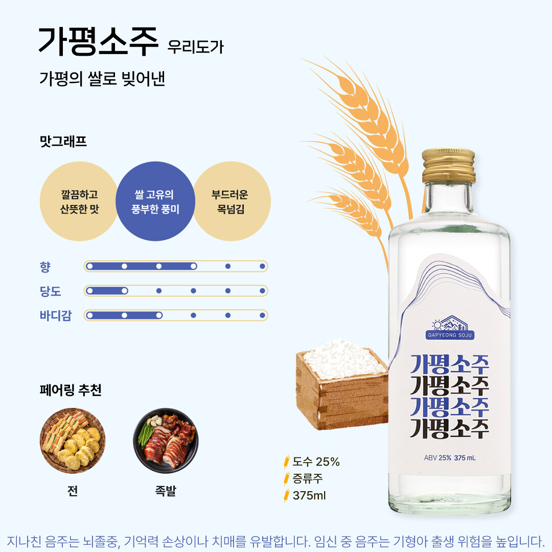 물 맑고 풍경 좋은 남이섬과 인접한 위치에 전통주를 만드는 우리도가 양조장이 있다. 우리도가 양조장의 가평소주는 가평의 쌀로 빚어낸 증류식 소주로 쌀 고유의 풍부한 풍미를 느낄 수 있다. 한 모금 마시면 부드럽게 넘어가면서도 은은한 향이 퍼지는 것이 특징이다. 전이나, 족발 같은 한식 메뉴와 페어링하기 좋다.