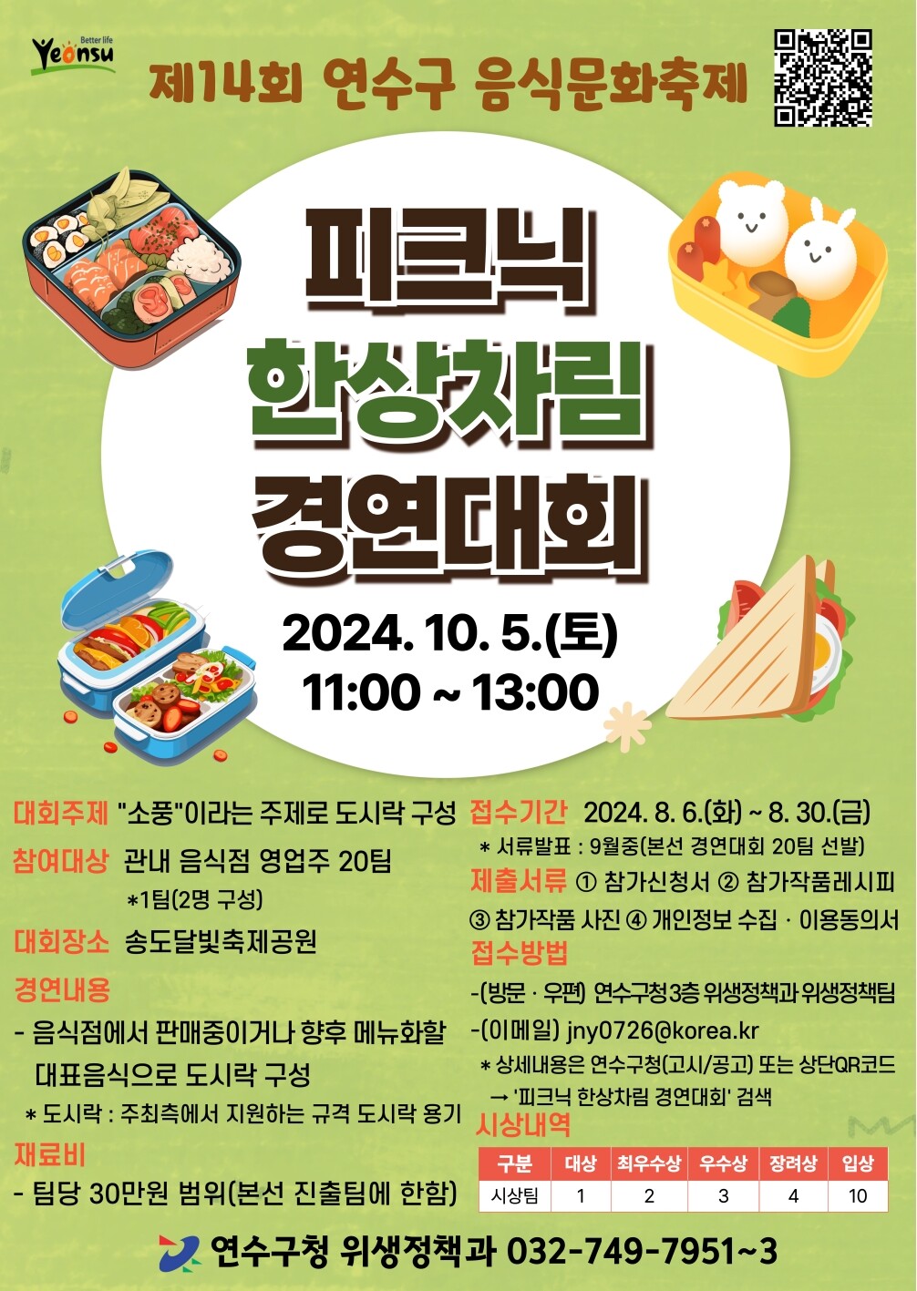 인천 연수구(구청장 이재호)가 오는 8월 30일까지 제14회 연수구 음식 문화축제 ‘피크닉 한상차림 경연대회’ 참가자를 모집한다고 밝혔다.