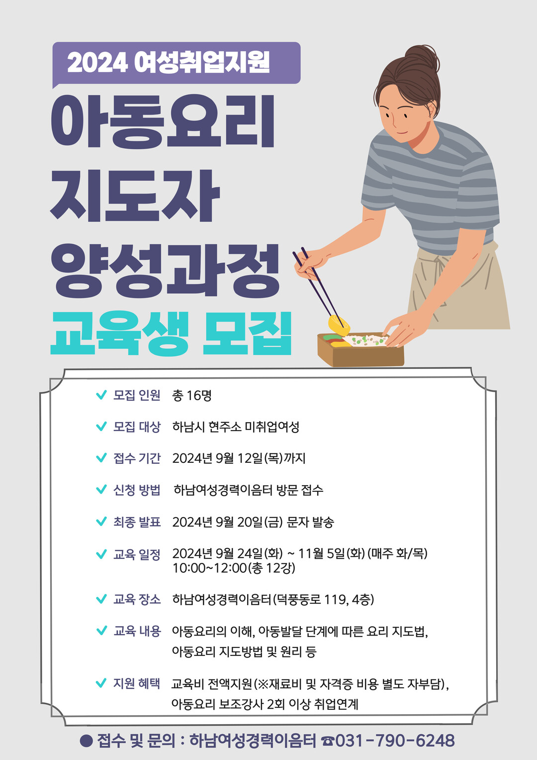 교육은 하남여성경력이음터에서 아동요리의 이해, 아동발달 단계에 따른 요리지도법, 실습 등과 같은 아동요리 지도자 과정에 필요한 내용으로 구성되며 교육대상은 하남시에 주소를 둔 미취업 여성이다.
