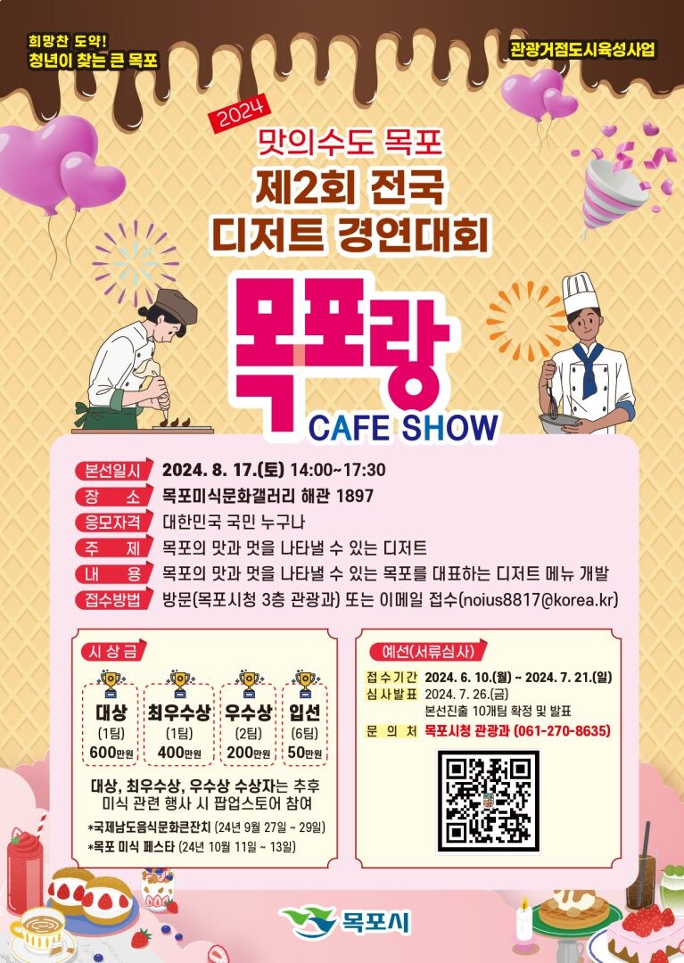 목포시가 전국 디저트 경연대회인 ‘목포랑 CAFE SHOW’ 참가자를 공개 모집한다고 밝혔다.