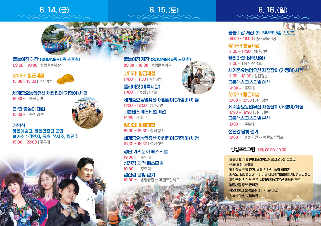 이번 축제는 송림물놀이장 개장과 함께 SUMMER 5종 스포츠를 즐길 수 있는 프로그램을 시작으로 참가자들이 황금재첩 모형을 찾으면 진짜 황금재첩으로 교환해주는 ▲찾아라! 황금 재첩, 세계중요농업유산으로 등재된 ▲재첩잡이(거랭이) 체험, ▲재첩 판매·시식관 등 다양한 재첩 관련 프로그램을 즐길 수 있다.