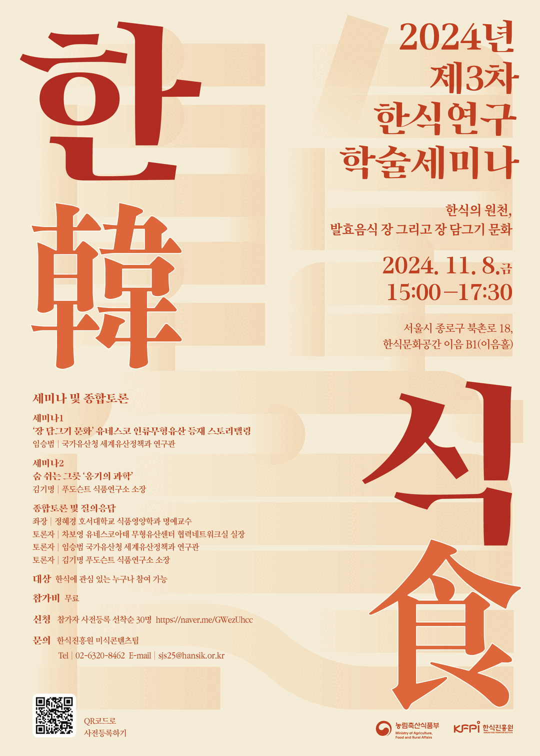 한식연구 학술세미나는 11월 6일(수)까지 선착순 30명을 모집하며, 네이버폼 링크 또는 QR코드를 통해서 사전 신청할 수 있다.