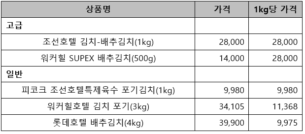 프리미엄 호텔 김치 상품명 및 가격(배추김치 기준)