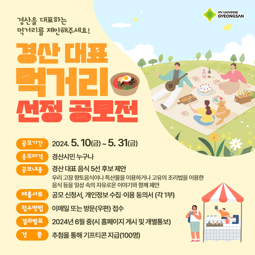 경산시가 5월 10일부터 31일까지 경산 대표 먹거리 선정 공모전을 개최한다. 응모는 경산시민 누구나 가능하며, 공모 내용은 경산 대표 음식 5선 후보 제안이다.