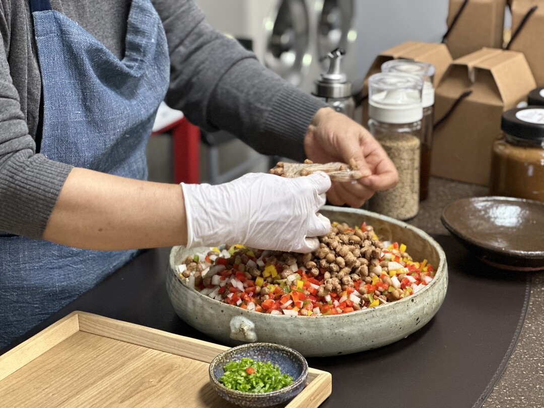 교육의 마무리는 ‘장맛나는’의 청국장을 이용한 청국장 샐러드 시연이었습니다. ‘장맛나는’의 청국장은 간을 하지 않고 출시되는데요. 청국장 향이 약한 대신 샐러드로 만들어 밥을 비벼먹거나 김에 싸먹어도 어울리고 크래커에 올려 간단한 술안주로도 잘 어울렸습니다.