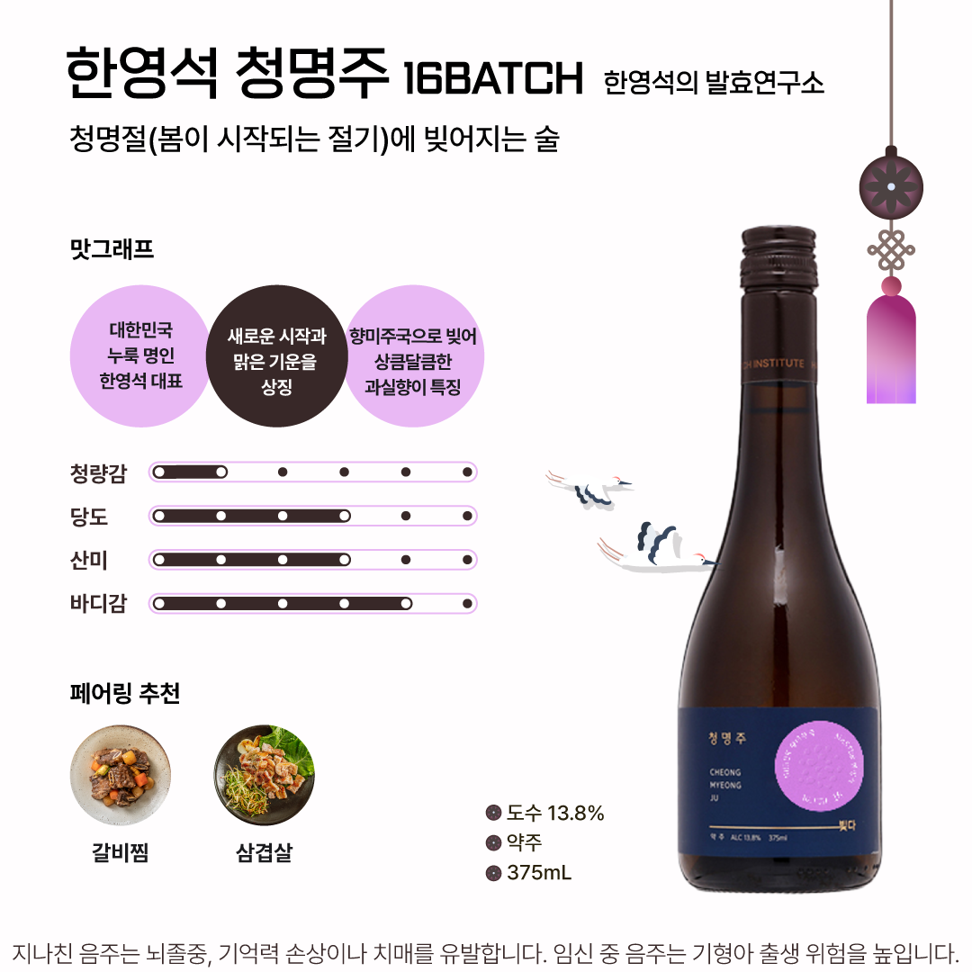한영석 청명주는 대한민국 누룩 명인 한영석 대표가 만든 술로, 새로운 시작과 맑은 기운을 상징한다. 찹쌀과 녹두를 45일 법제 후 저온 발효와 숙성을 거쳐 완성된다. 자두와 파인애플의 과실향과 산미가 돋보이며 갈비찜이나 삼겹살 같은 한식과 잘 어울린다.