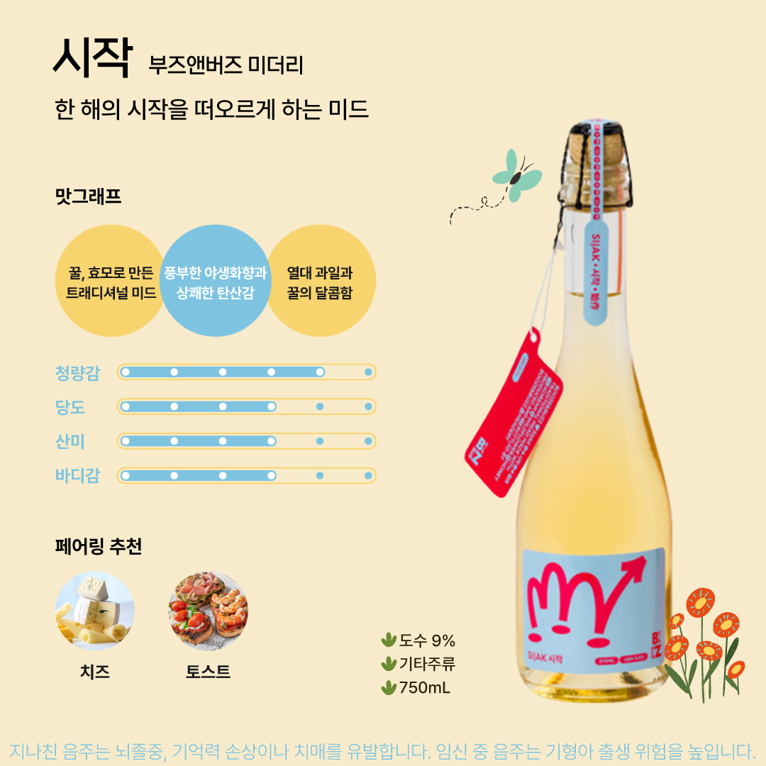 시작은 꿀과 효모로 만든 트래디셔널 미드로, 부즈앤버즈 양조장이 처음 선보인 벌꿀술이다. 열대 과일과 꿀의 풍부한 향미와 탄산감이 특징이다. 이름처럼 새로운 시작을 떠올리게 하는 술로, 달콤하면서도 상쾌한 맛을 선사한다.