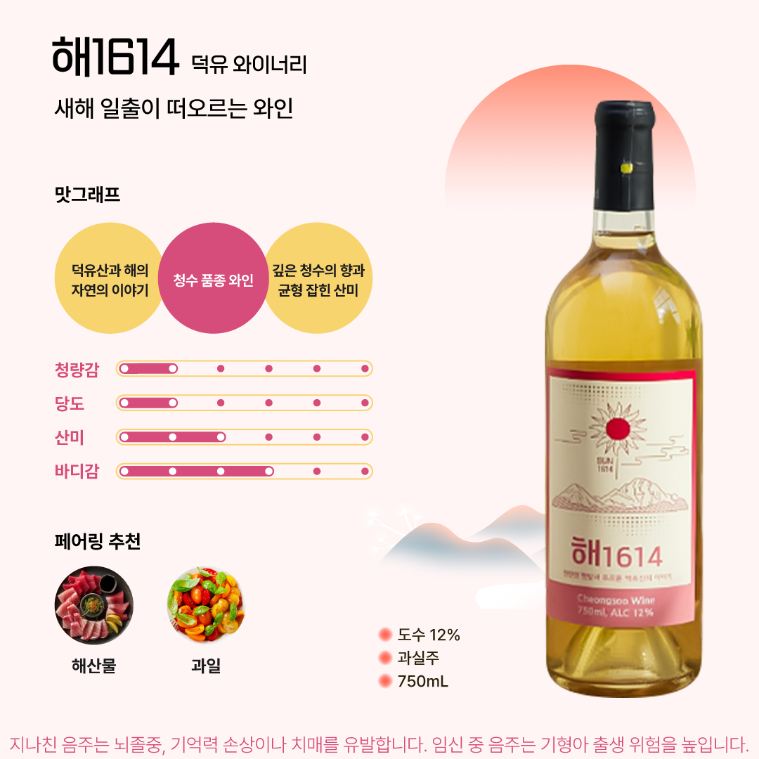 해1614는 전라북도 무주 덕유와이너리에서 생산되는 와인이다. 덕유산의 자연 이야기를 담은 와인으로, 16도의 일정한 온도에서 발효와 숙성을 통해 깔끔하고 균형 잡힌 맛을 구현했다. 은은한 단맛과 청수의 향이 조화를 이루며, 해산물이나 과일과 잘 어울린다.