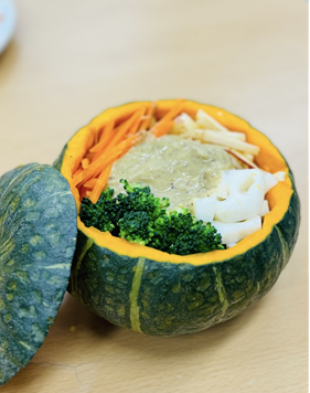 7. 다 만들어진 호박죽을 안을 파낸 호박통에 옮겨 담는다.