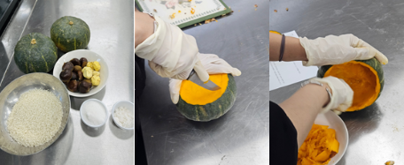 단호박 2개, 쌀 한 컵, 밤 10알, 설탕 3큰술, 소금 1/2큰술, 물 반 컵