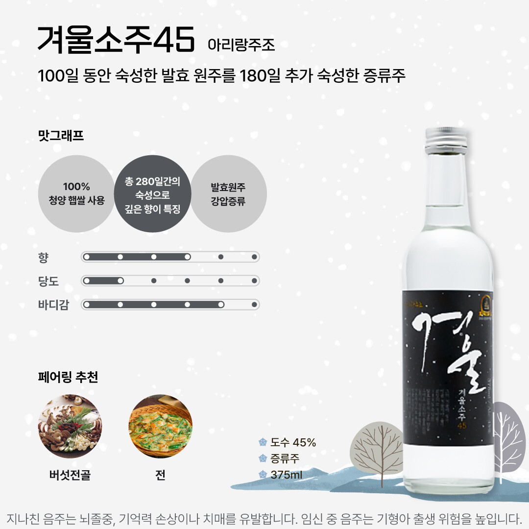 이름부터 겨울이 들어간 겨울소주는 충남 청양 칠갑산 자락 방죽골에 자리한 아리랑 주조에서 생산한 증류주다. 200미터 파 내려가 얻은 지하수와 100% 청양 햅쌀만을 이용해 만들어졌다. 100일 동안 숙성한 발효 원주를 180일 추가 숙성하여 깊은 향과 부드러움을 느낄 수 있다.