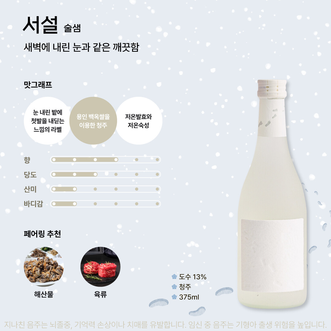 서설은 최고의 경기미인 용인 백옥쌀을 사용한 100% 국내산 청주다. 새벽에 내린 눈과 같은 깨끗함이라는 뜻으로 눈이 내린 밭에 첫발을 내딛는 듯한 모습을 형상화하여 라벨에 담았다. 보기만 해도 겨울의 첫눈이 절로 생각나는 듯하다. 한국토착효모를 배양한 알코올발효로, 한모금 마시면 특유의 과실향이 은은하게 퍼진다.