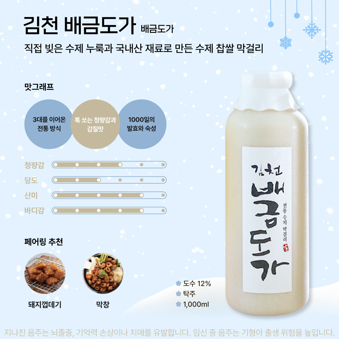김천 배금도가는 김천의 백두대간 우두령골에 위치한 배금도가 양조장에서 생산한다. 미생물이 가장 살기 좋은 물 좋고 공기 좋은 청정지역에서 천연 자연의 방법으로 막걸리를 빚고 있다. 특히, 직접 빚은 수제 누룩과 국내산 재료로 만든 전통 방식 그대로의 수제 찹쌀 막걸리다. 3대를 이어온 전통 방식으로 만들어 가장 적절한 온도와 발효, 숙성을 거쳤다. 오랜 기다림의 미학이라고 할 수 있다.