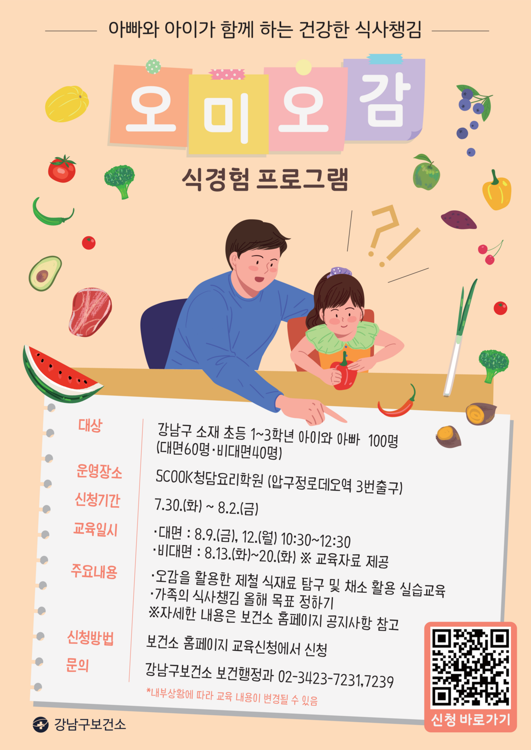 대면 참여는 총 2회로 8월 9일과 12일 오전 10시 30분부터 오후 12시 30분까지 SCOOK청담요리학원에서 진행하며, 비대면 참가자는 8월 13일부터 20일까지 선착순으로 강남구보건소 1층 영양플러스실을 방문하여 교육자료와 제철 음식 요리법을 받으면 된다.