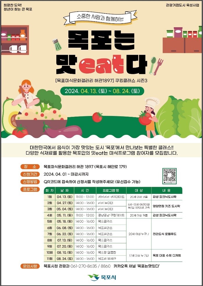 목포시가 4월 13일부터 8월 24일까지 ‘목포미식문화갤러리 해관1897’에서 쿠킹클래스를 운영한다고 밝혔다.