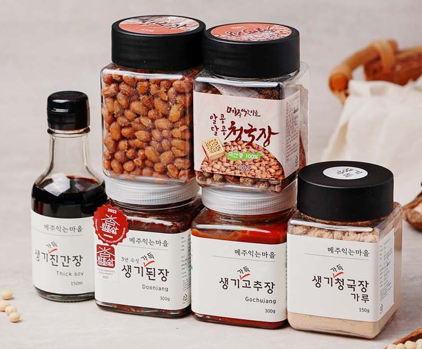 메주익는마을의 대표 제품들, 왼쪽부터 생기가득진간장, 생기가득된장, 생기가득고추장, 생기가득청국장가루, 알콩달콩 청국장 / 사진= 메주익는마을 제공