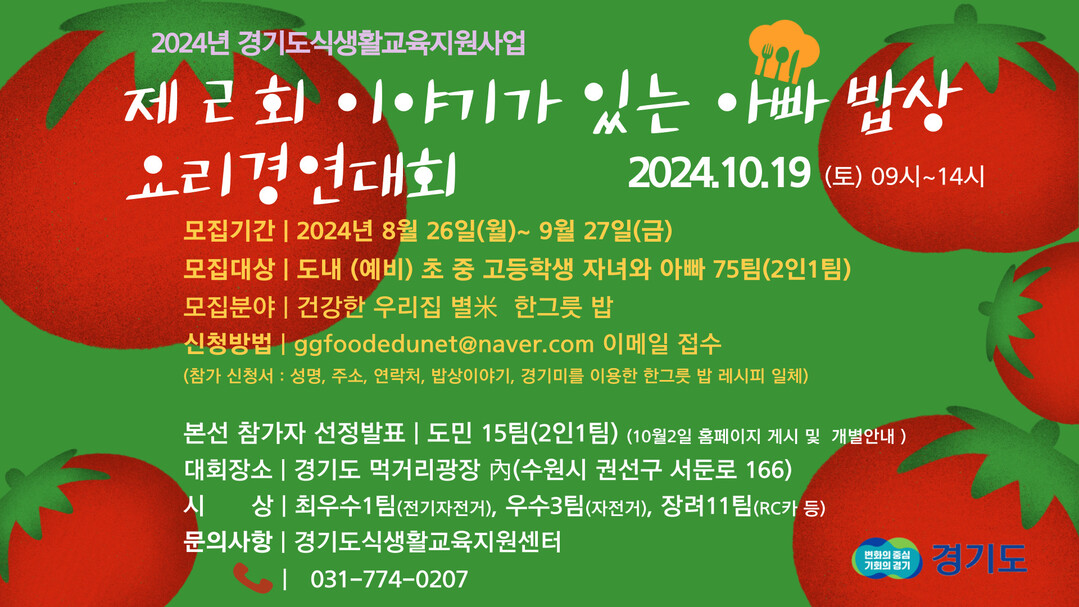 경기도(도지사 김동연)가 8월 26일부터 9월 27일까지 제2회 이야기가 있는 아빠 밥상 요리경연대회 참가자를 모집한다고 밝혔다.