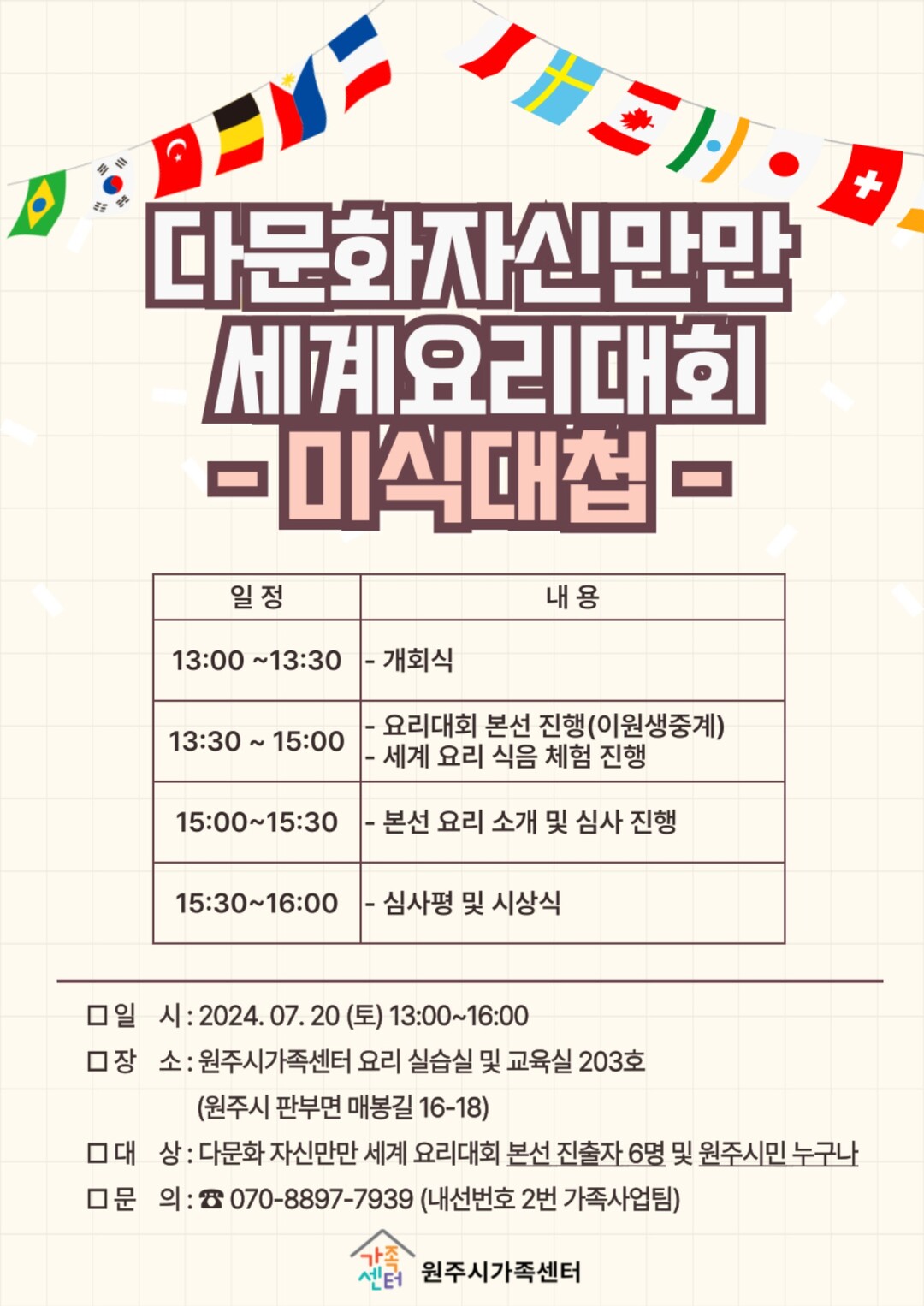 원주시가족센터(센터장 남궁은임)는 오는 20일 오후 1시 원주시가족센터에서 다문화 자신만만 세계 요리대회 본선 ‘미식대첩’을 개최한다.