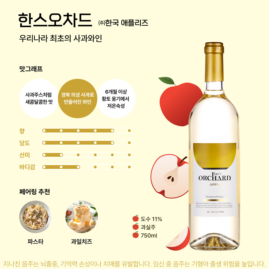 한스오차드는 경북 의성의 사과로 만들어진 우리나라 최초의 사과 와인이다. 대대로 이어진 사과 과수원 운영 노하우와 15년의 연구 끝에 탄생한 한국적인 사과 와인으로, 사과즙을 효모와 섞어 황토 옹기에서 6개월 이상 저온 숙성해 사과의 새콤달콤한 맛과 향이 가득하다. 한 모금 마시면 사과의 달콤함과 함께 약간의 오크 풍미가 느껴지며, 깔끔한 마무리가 특징이다. 파스타나 과일 치즈와 함께하면 사과의 깊은 달콤함을 온전히 즐길 수 있다