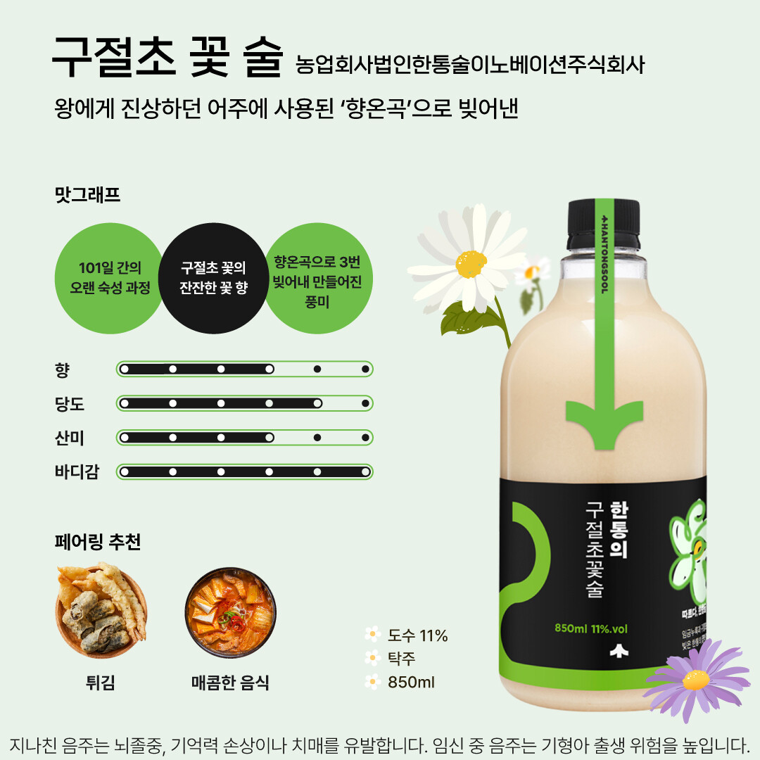 구절초 꽃 술은 담백하고 고소한 구절초 꽃향을 담아낸 술이다. 왕에게 진상하던 어주를 만들 때 사용했던 전통 누룩 ‘향온곡’을 사용해 빚어내며, 세 번의 빚는 과정을 거쳐 풍미를 더했다. 50일간의 누룩 발효와 숙성, 21일간의 발효, 그리고 30일간의 저온 완전 숙성 과정을 거친 <구절초 꽃 술>은 총 101일에 걸친 오랜 숙성 끝에 탄생한다. 첫 입에는 구절초 꽃의 은은한 향과 단맛이 느껴지며, 마무리에는 상큼하고 구수한 곡향이 여운을 남긴다. 산뜻하고 달콤한 맛 덕에 튀김류나 매콤한 음식과 잘 어울린다.
