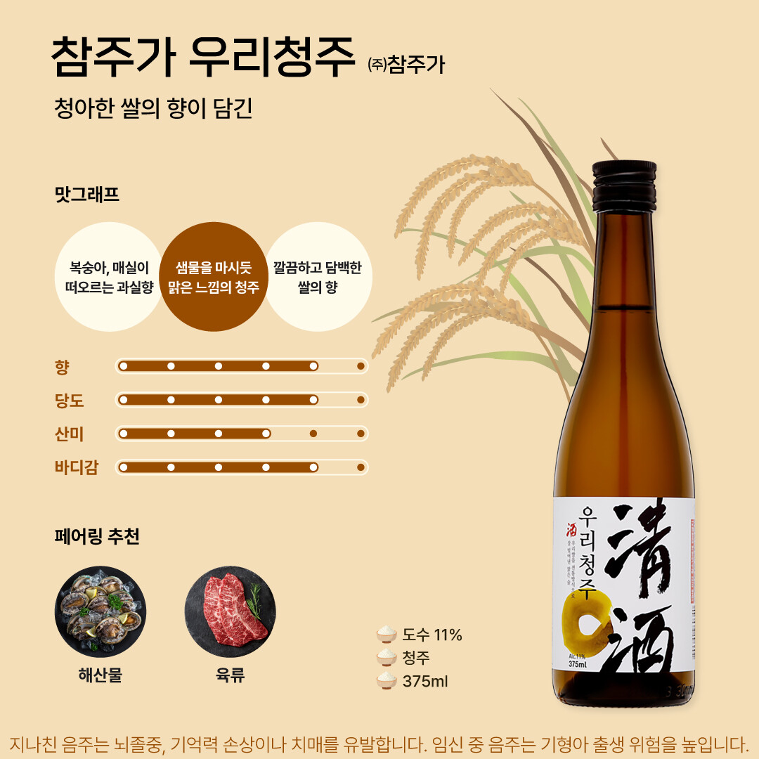 우리청주는 순창에서 우리 쌀만을 사용해 만들어진 청주다. 저온 발효와 숙성을 통해 부드럽고 풍부한 맛을 자랑하며, 샘물처럼 맑고 청아한 느낌을 준다. 쌀의 맛과 향을 온전히 담고 있는 <참주가 우리청주>는 복숭아와 매실을 떠올리게 하는 산뜻한 과실향과 깔끔하고 담백한 쌀의 풍미가 은은하게 퍼진다. 육류, 해산물, 과일, 치즈 등 다양한 음식과 잘 어우러지며, 차갑게 마시는 것을 추천하나 겨울철에는 따뜻하게 데워 마셔도 또 다른 매력을 느낄 수 있다.