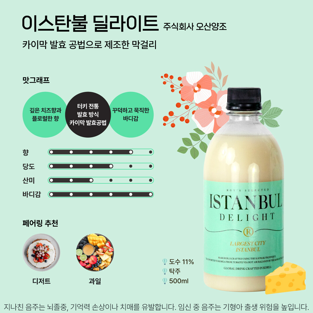 이스탄불 딜라이트는 터키의 전통 발효 방식인 카이막 발효 공법으로 만든 막걸리다. 100년 전통의 카이막 제조법에서 착안해 만들어졌으며, 깊은 치즈 향과 꽃 향이 특징이다. 묵직하고 꾸덕한 바디감과 크림 같은 부드러움이 <이스탄불 딜라이트>의 매력이다. 다양한 안주와 조화를 이루지만, 특히 달콤한 과일이나 디저트와 함께하면 그 달콤함이 한층 더 돋보인다.