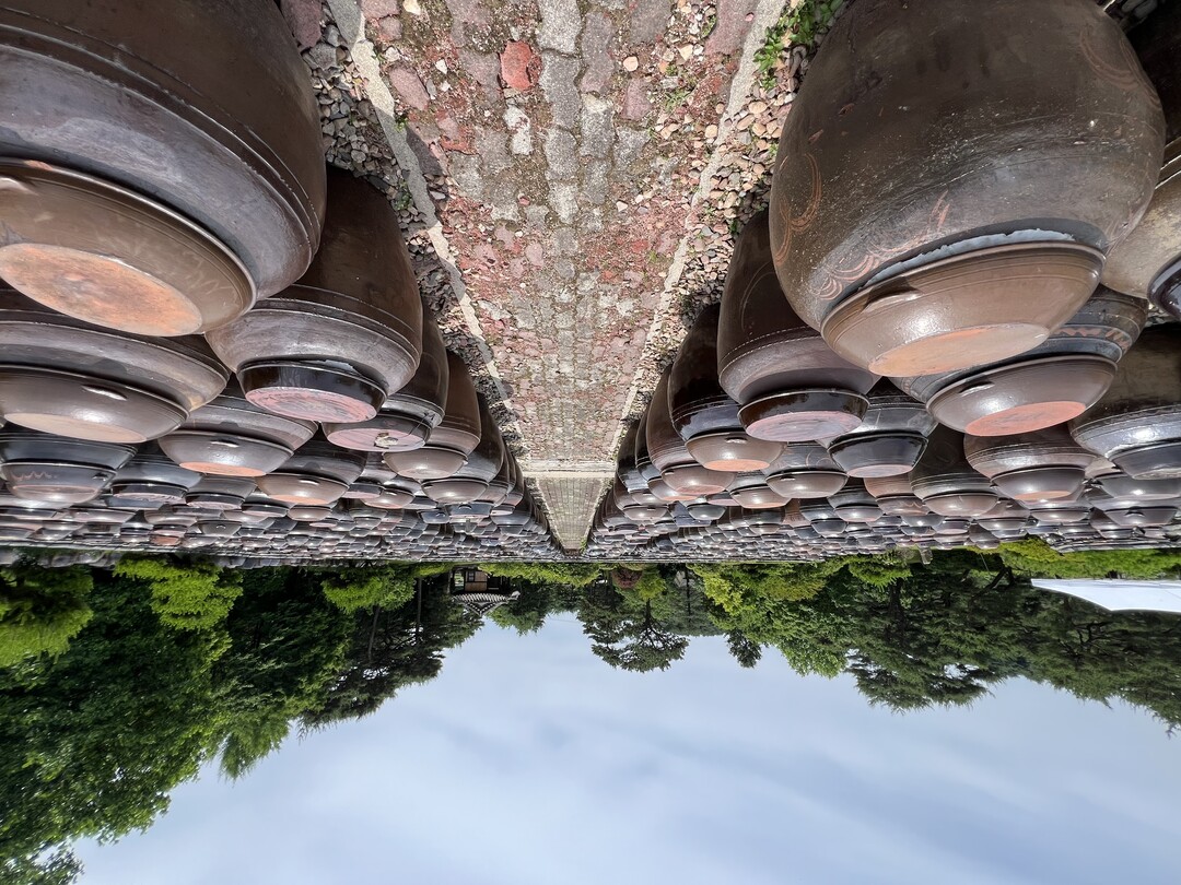 영주는 서울과 경기지역에서는 가깝지 않은 길이었지만 마을에 들어서자 피로함이 싹 가실 만큼 예사롭지 않은 세월의 흔적이 곳곳에 묻어있더군요. 한국의 산과 하늘에 멋지게 어울리는 마을의 나무들이 그러했습니다. 무량수의 입구부터 1,000여 개의 항아리가 있는 장독대까지 한국의 소나무와 바위들이 듬직하게 길 안내를 해주고 있었는데 예전에는 마을의 작은 학교였다고 하네요. 너른 잔디밭과 듬직하고 멋진 소나무와 바위가 어우러진 장독대는 학교 운동장이었던 겁니다. 초록이 넘실거리는 잔디밭에 운동회처럼 하얀 천막을 치고 학교 교실에 있던 의자들이 초대받은 사람들을 기다리고 있었어요. 나이 어린 학생들이 쑥쑥 자라는 공간에서 우리 장들이 항아리에서 자라고 있는 모습이 우리의 미래였으면 좋겠다고 생각을 했습니다.