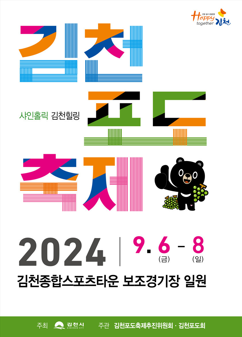 경북 김천시(시장 김춘섭)는 9월 6일부터 9월 8일까지 김천종합스포츠타운 보조경기장 일원에서 ‘2024 김천포도축제’를 개최한다고 밝혔다.