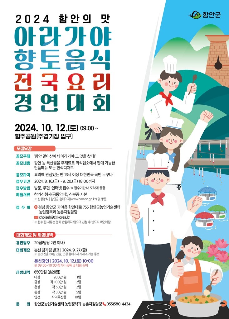 경남 함안군(군수 조근제)은 9월 20일까지 2024 ‘함안의 맛’ 아라가야 향토음식 전국요리 경연대회 참가자를 모집한다고 밝혔다.