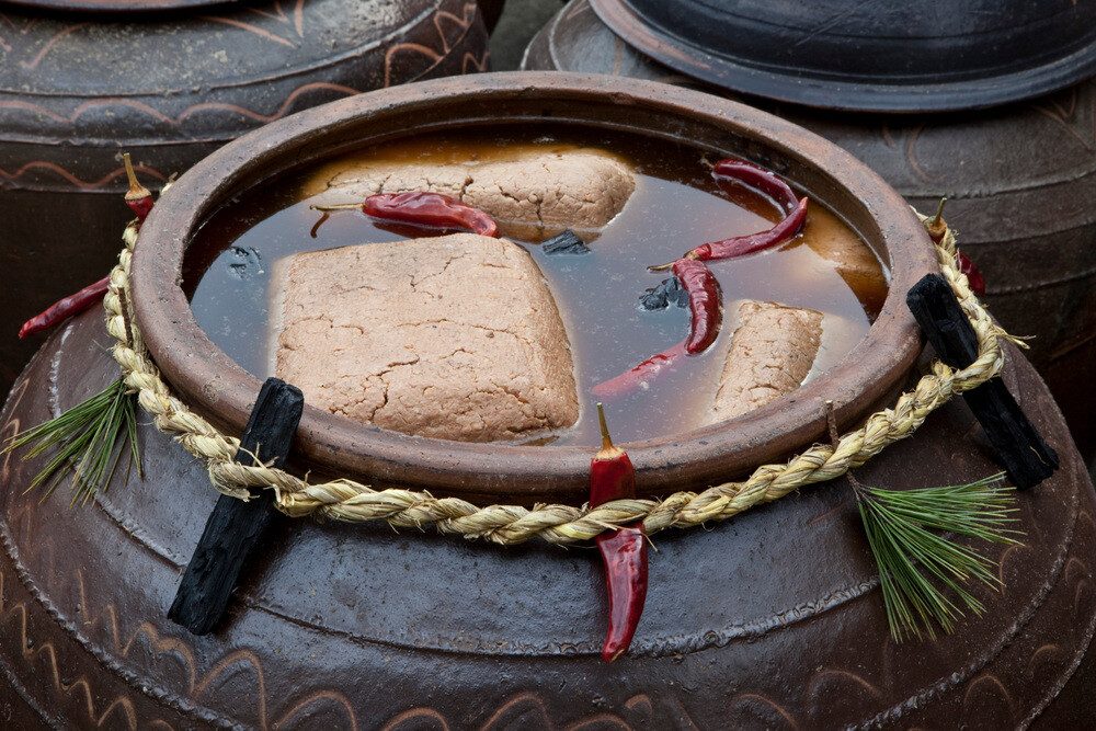 소금을 푼 물에 잘 띄운 메주를 붓고 햇볓과 선선한 바람을 더해 40-60일 숙성시키면 장이 완성 / 사진=장독대뉴스 |
