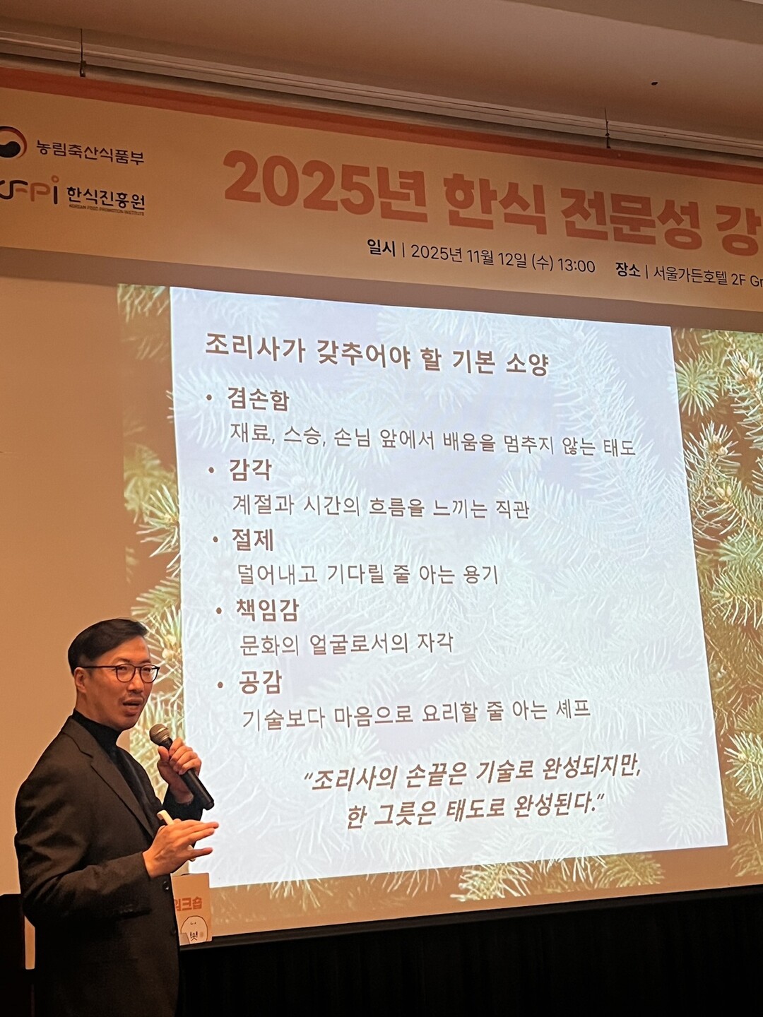 농림축산식품부와 한식진흥원이 주최·주관하는 ‘2025년 한식 전문성 강화 워크숍’이 11월 12일 마포구 서울가든호텔에서 개최됐다. 이번 워크숍은 한식에 대한 관심을 높이고, 차세대 한식 인재를 발굴·육성하기 위한 전문성 강화 프로그램으로 마련됐다. 행사는 ▲현직 셰프에게 듣는 한식 다이닝 스토리 ▲AI와 한식 강연 ▲참여형 이벤트로 구성됐다.