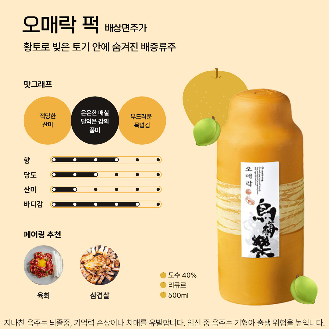 <오매락 퍽>은 특별한 날을 더욱 특별하게 만들어줄 리큐르다. 천연 황토로 빚은 퍽토기 안에 오매락 술이 담겨 있어, "퍽" 하는 소리와 함께 술이 드러나는 독특한 경험을 선사한다. 이 술은 국산 배 증류원액과 구운 매실을 사용해 향온 암실에서 숙성한 프리미엄 고도주로, 40도의 깊고 묵직한 맛이 특징이다. 은은한 매실 향과 덜 익은 감의 풍미가 어우러져, 매실의 향기와 산미가 제철 회, 육회, 삼겹살과도 조화롭게 어울린다.