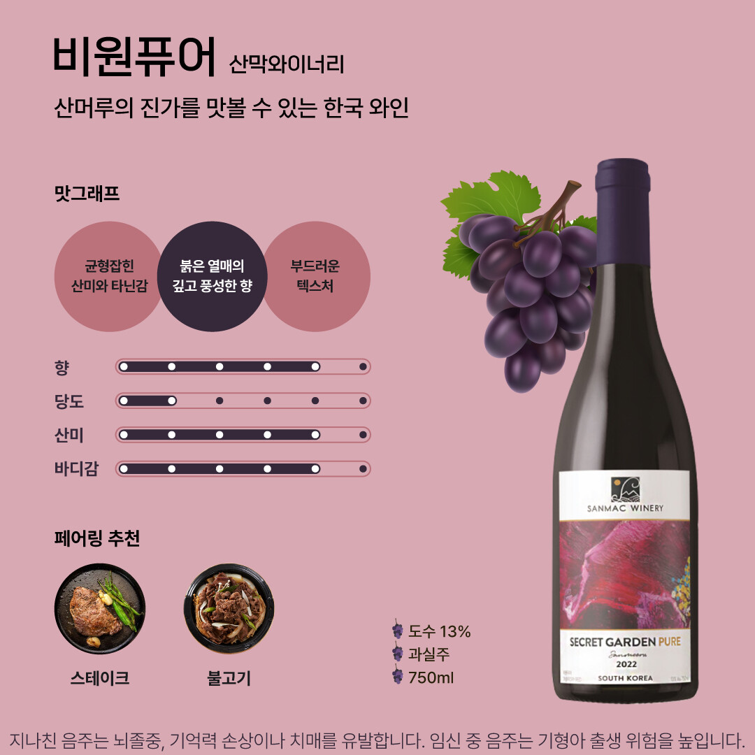 <산막와인 비원퓨어 드라이 레드>는 100% 산머루로 만들어져 진한 풍미를 자랑하는 한국 와인이다. 꽃향기와 붉은 열매 향이 조화를 이루며, 한 모금마다 깊고 풍성한 향을 느낄 수 있는 것이 특징이다. 산미와 타닌의 균형 잡힌 맛, 그리고 오래 지속되는 여운이 매력적이다. 이 와인은 장기 숙성이 가능해 시간이 지날수록 다양한 향과 맛이 더해지며 더욱 깊어진 풍미를 선사한다. 은은한 산미는 육류 요리의 느끼함을 잡아줘 소고기 요리, 보쌈, 불고기 등과 완벽한 페어링을 이룬다. 패키지와 라벨에는 산막와이너리 대표이자 화가인 대표의 작품이 담겨 있어 특별한 선물로도 손색이 없다.