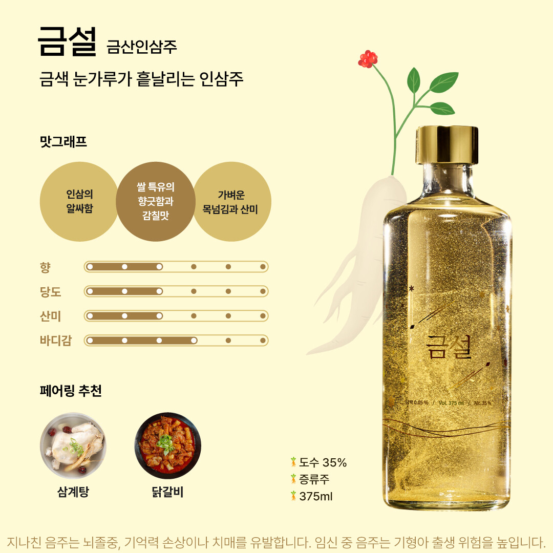 <금설>은 김창수 명인이 빚은 전통 인삼주로, 5년근 이상의 인삼을 사용해 은은한 인삼 향과 가벼운 목넘김, 산미가 특징이다. 쌀 특유의 향긋함과 감칠맛이 부드럽게 퍼지며, 알싸한 맛이 식욕을 돋운다. 삼계탕이나 고기와 함께 즐기면 더욱 풍부한 맛을 느낄 수 있다. 또한, 투명한 증류주 안에 금가루가 들어 있어 시각적인 즐거움도 제공하며, 함께 구매할 수 있는 LED 받침대를 사용하면 금가루가 빛나면서 연말 분위기를 한층 더 고조시킨다.