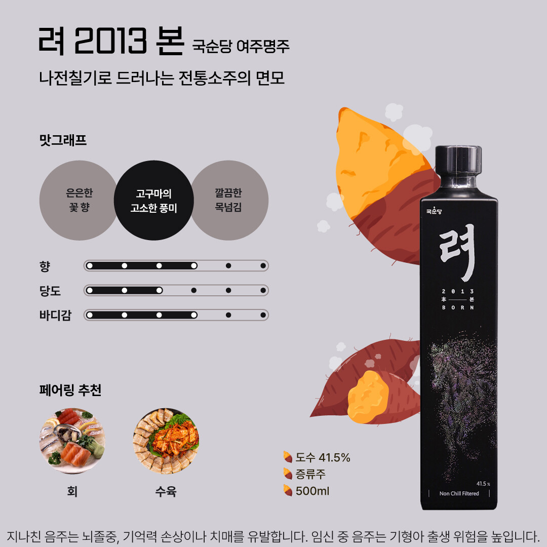 <려 2013 본>은 은은한 꽃 향 뒤에 고구마의 고소한 풍미가 어우러지는 증류식 소주다. 상온에서 즐기면 고구마의 자연스러운 달큰함과 쌀의 깊은 감칠맛을 더욱 풍부하게 느낄 수 있다. 특히, 아로마 성분이 모여 형성된 하얀색 결정체는 무여과 증류주의 자연스러운 특징을 그대로 보여준다. 이 제품은 무광 블랙 병에 한국 전통 자개 공예인 나전칠기에서 영감을 받은 고급스러운 디자인을 더해 소장 가치를 높였다. 구수하면서도 깔끔한 맛이 특징이며, 수육이나 회 같은 음식과 곁들였을 때 본연의 풍미를 돋우며 깔끔한 마무리를 선사한다.