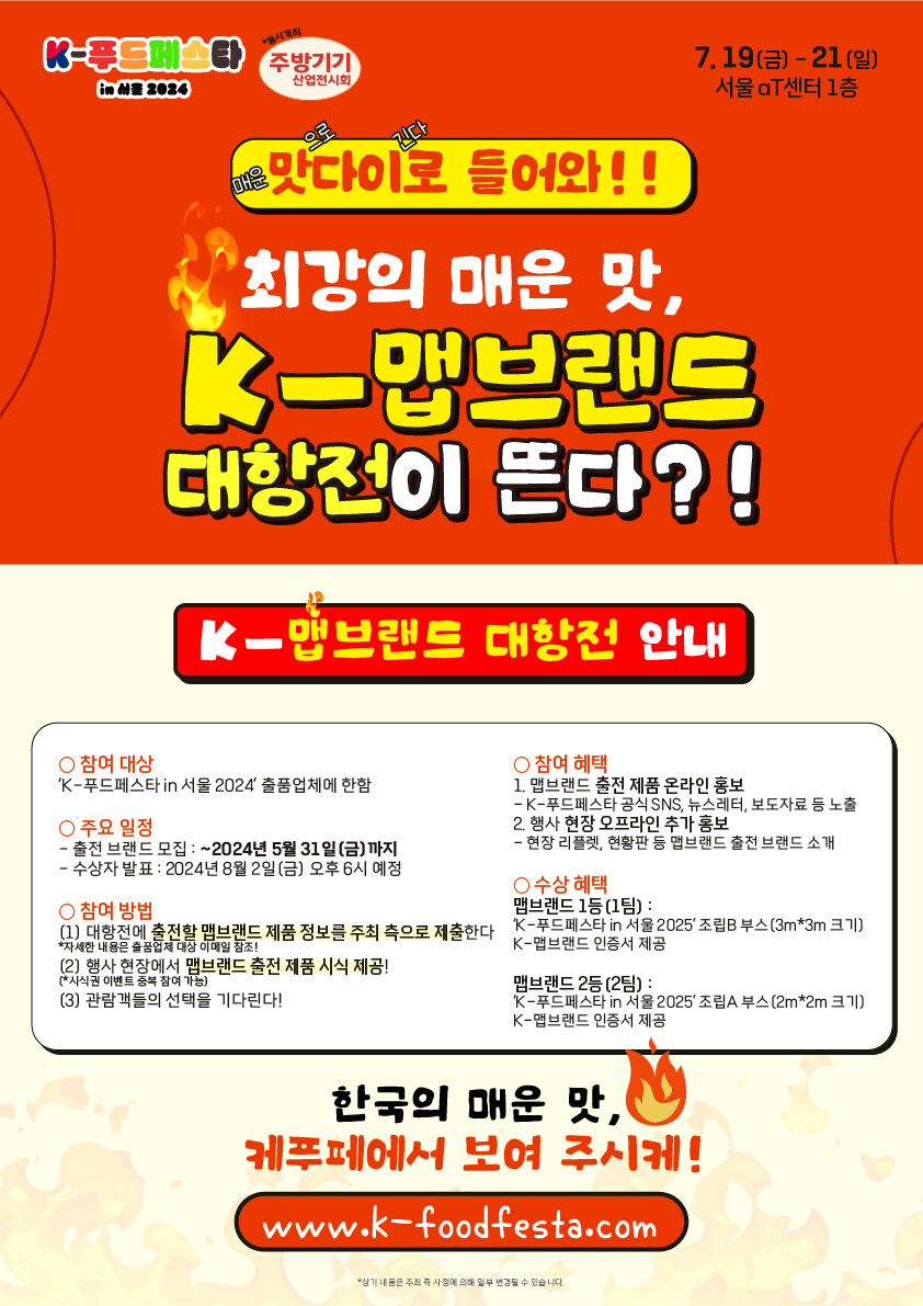 특히, 이번 ‘K-푸드페스타 in 서울 2024’ 출품 업체에 한해 한국의 ‘매운맛’을 보여줄 수 있는 ‘K-맵브랜드 대항전’ 참가팀을 모집한다.
