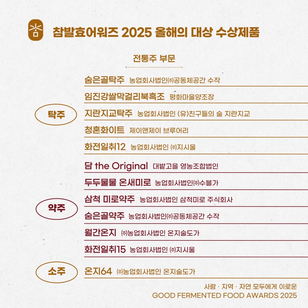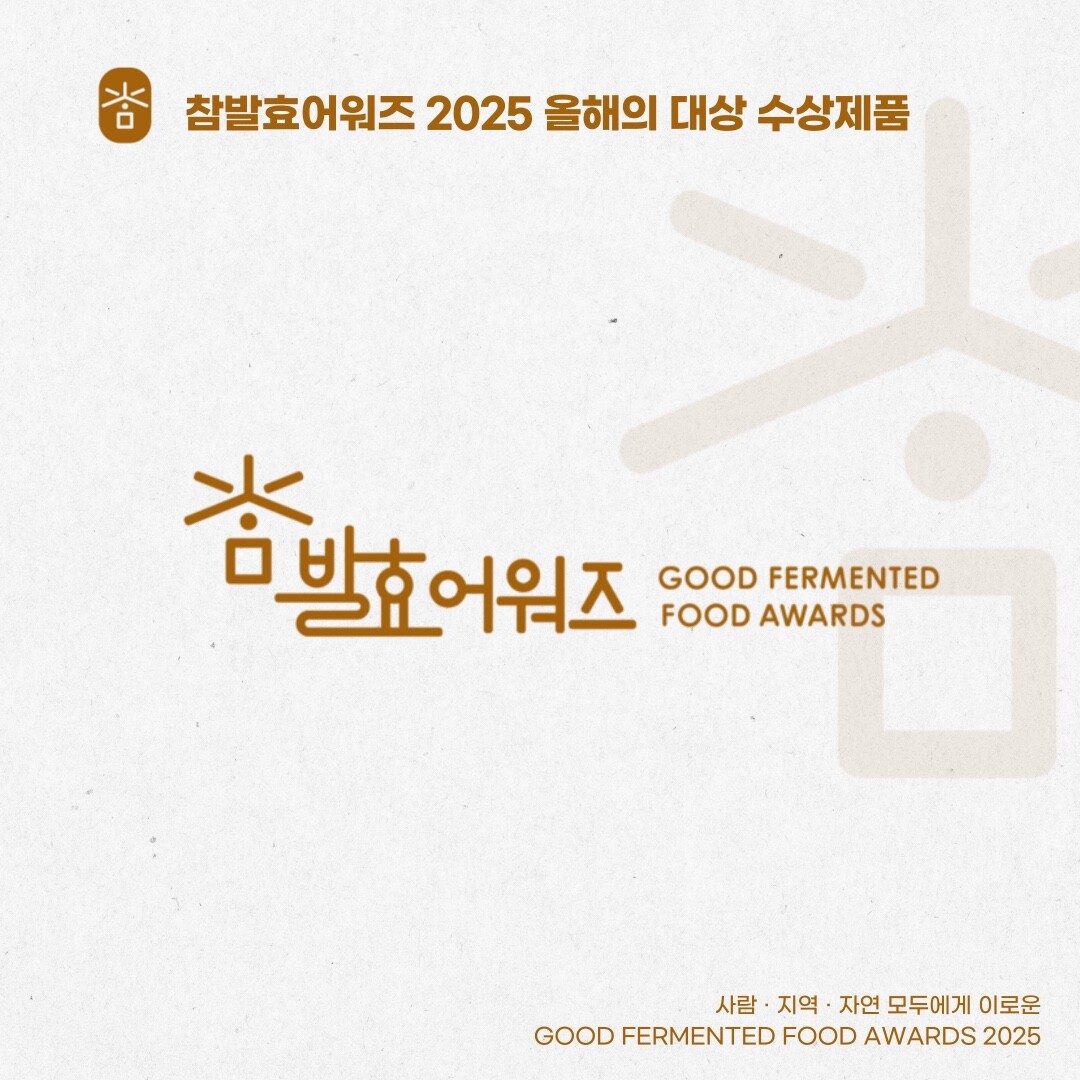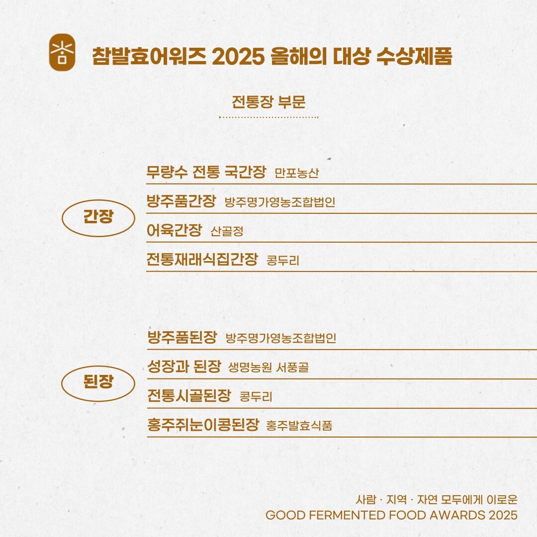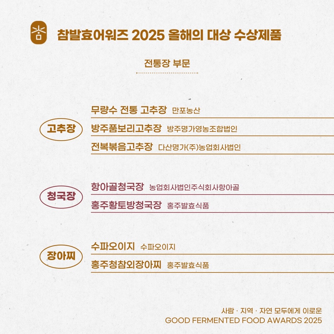 ‘참발효어워즈2025’ 대상으로 전통장 부문에서 간장 4점(△무량수 전통 국간장, △방주품간장, △어육간장, △콩두리 전통재래식집간장), 된장 4점(△방주품된장, △서풍골 성장과 된장, △콩두리 전통시골된장, △홍주쥐눈이콩된장)이 선정됐다.