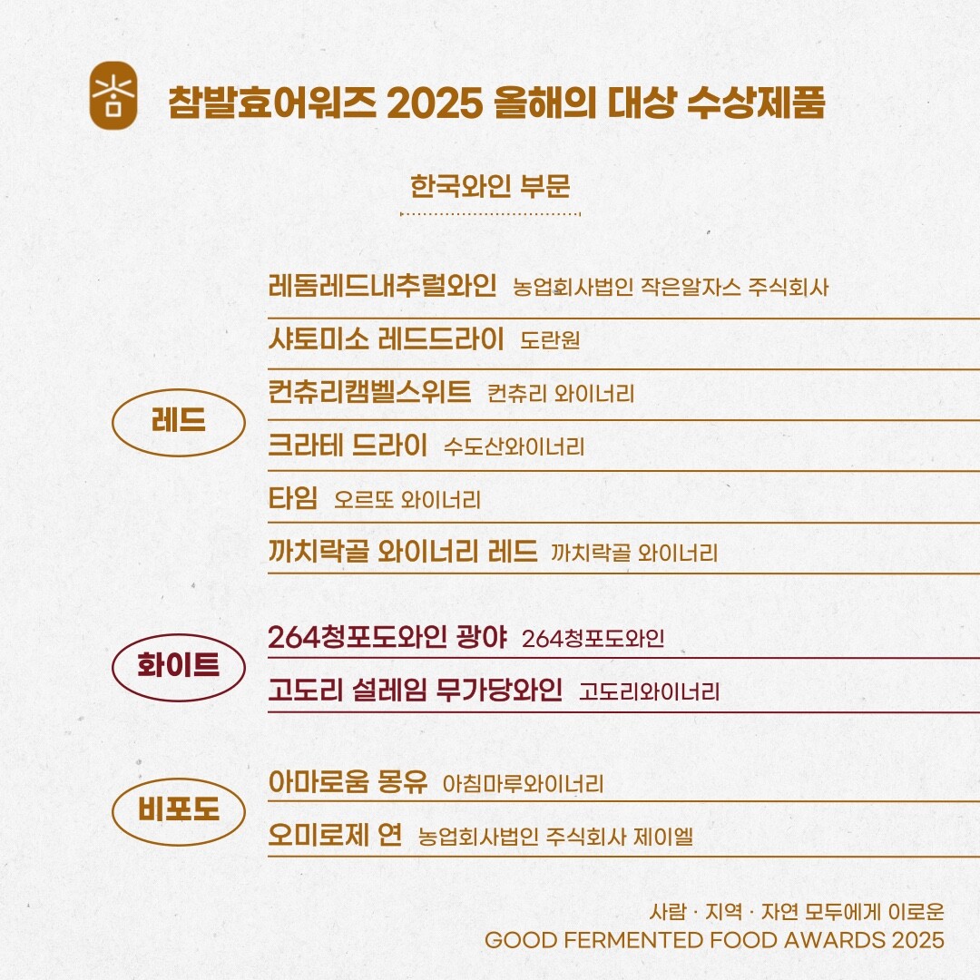 한국와인 부문 대상으로는 10점(△고도리 설레임 무가당와인, △까치락골 와이너리 레드, △레돔 레드내추럴와인, △샤토미소 레드드라이, △아마로움 몽유, △오미로제 연, △컨츄리캠벨스위트, △크라테 드라이, △오르또 타임, △264청포도와인 광야)이 선정됐다.