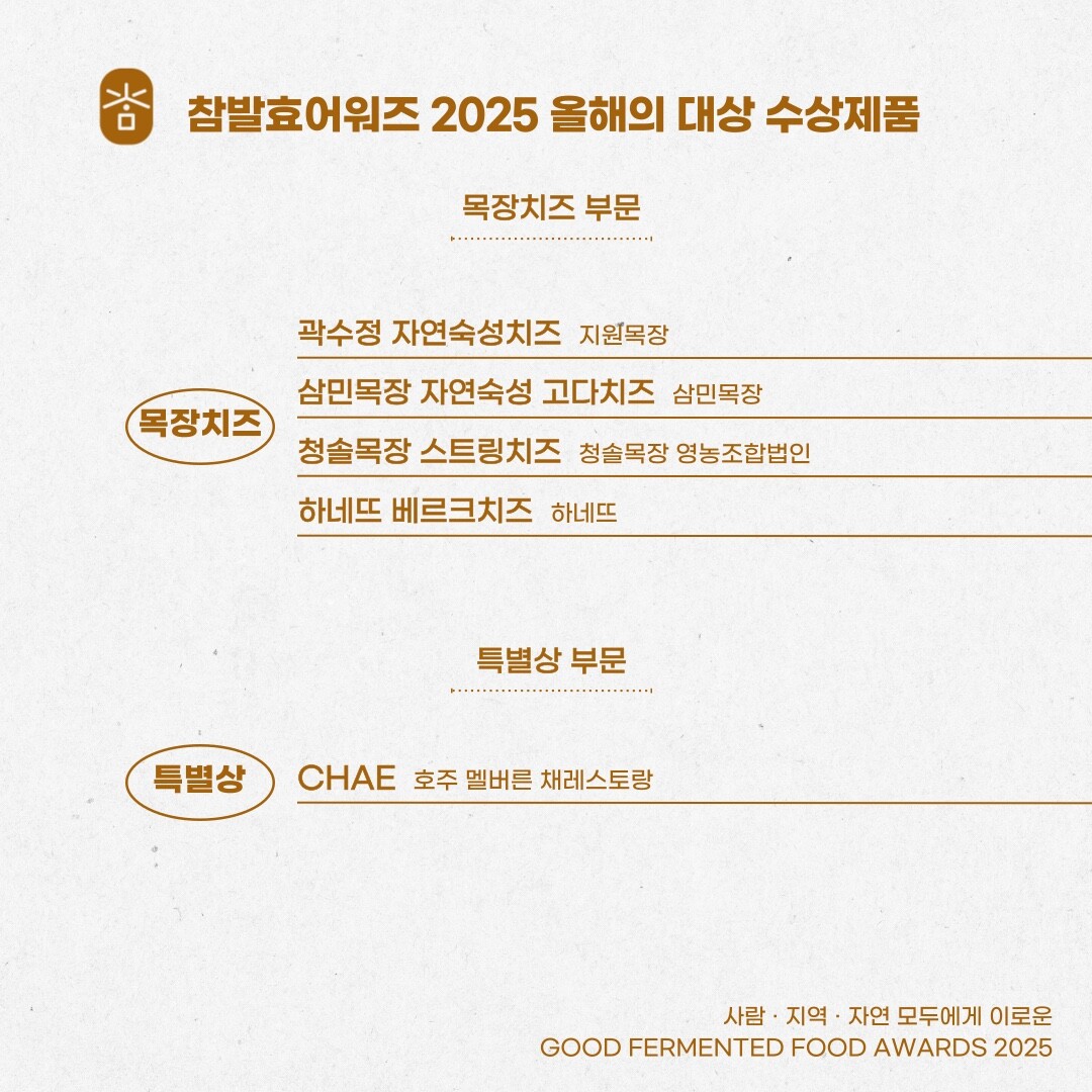 목장치즈 부문에서는 4점(△곽수정 자연숙성치즈, △삼민목장 자연숙성 고다치즈, △청솔목장 스트링치즈, △하네뜨 베르크 치즈)이 대상을 차지했으며, 올해 ‘특별상’은 호주에서 간장, 된장, 고추장 등 한식장을 직접 만들어 음식에 사용하는 ‘채 레스토랑’(대표 윤유라, 채정은)에게 수여한다. 한국 발효식품의 맛을 세계에 알린 채 레스토랑의 공로를 인정해, 참발효어워즈에서 감사와 격려를 담아 특별상을 수여할 예정이다.