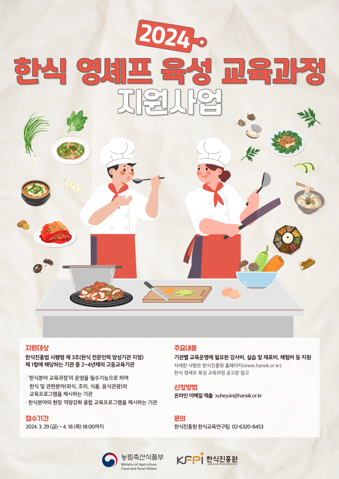 농림축산식품부(장관 송미령)와 한식진흥원(이사장 임경숙)은 ‘2024년 한식 영셰프 육성 교육과정 지원사업’ 대상기관을 오는 18일까지 모집한다.