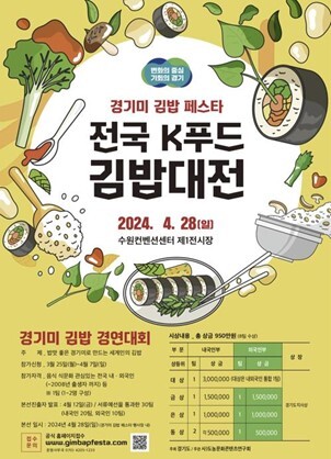 경기도가 수원컨벤션센터에서 개최되는 1회 전국 K푸드 김밥대전의 참가자를 325일부터 47일까지 모집한다고 밝혔다.